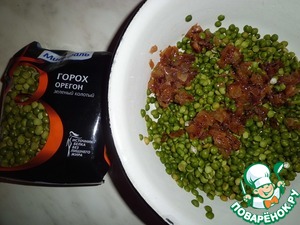 Зеленый горох от Мистраль не требует замачивания, поэтому промываем его и добавляем обжаренный лук.