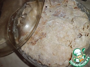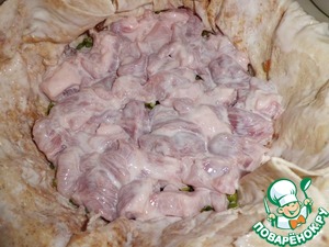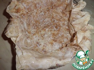 Лаваш разрезаем пополам (у нас большие лаваши ок. 70 см.) Обмакиваем в кефир со всех сторон (берем дополнительный кефир, если вы замачивали свинину) и выкладываем дно и стенки жаропрочной посуды, что бы кончики свисали. Выкладываем в два слоя!