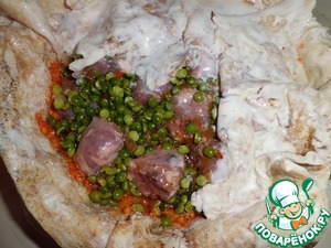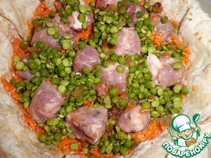 Первым слоем выкладываем 2/3 гороха, солим и выкладываем сверху свинину. Солим и перчим по вкусу.