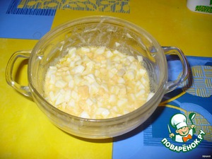 Вареные яйца очистить и нарезать мелкими кубиками. Посолить.