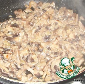 Грибы вымыть, порезать, добавить к луку, обжарить вместе до испарения жидкости, посолить, добавить сметану, потушить еще минут 5, слегка остудить. -
