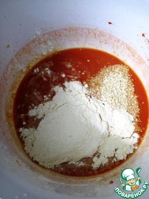 Для оранжевого теста в теплой воде растворяем соль, сахар, томатную пасту, растительное масло и дрожжи. Затем добавляем отруби