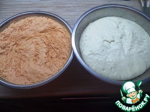 Раскатать одну часть белого теста и одну часть оранжевого в пласт, размером чуть меньше, чем форма для хлеба
