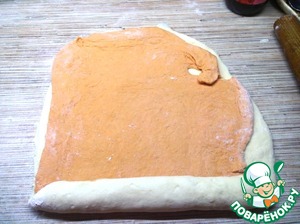 Положить оранжевое тесто на белое и скатать в рулет.