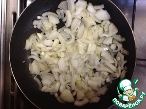Для начала чистим овощи. Лук режем крупно ( полукольцами) и кладем на разогретую сковороду.