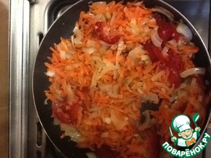Трем морковь на крупной терке, режем болгарский перец полукольцами и добавляем к луку. готовим эту смесь до полуготовности.