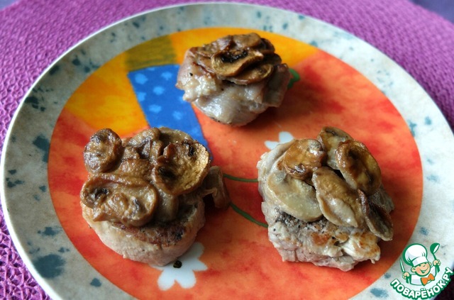 На пекарскую бумагу выкладываем мясо. Сверху кладем грибы. Ставим в разогретую до 190 градусов духовку на 15-20 минут. Приглядывайте! Духовки разные и капризные!