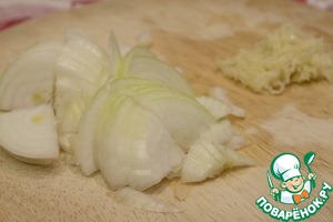 Лук и чеснок почистить. Лук нарезать полукольцами, чеснок натереть на мелкой терке.