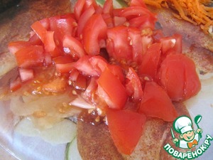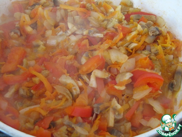 Лук, морковь, помидоры, перец, грибы, чеснок, специи соединить,