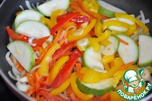 Добавляем цуккини, перец, чеснок и жарим-тушим 5 минут.