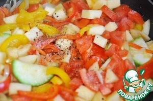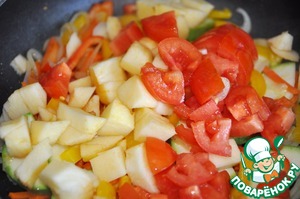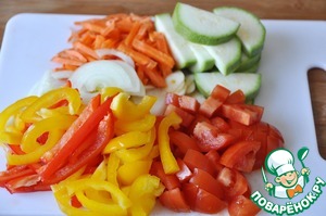 Лук и цуккини - полукольцами, перец болгарский и морковь - тонкими полосками, чеснок - пластинами, помидоры - кубиками. -