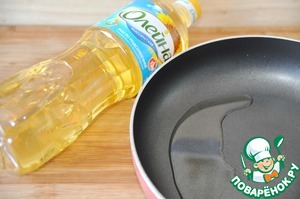 Берём подсолнечное масло "Олейна", наливаем на сковороду.