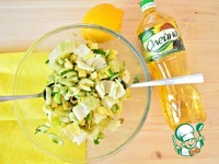 Готовим заправку. В маленькой миске смешиваем белый винный уксус, сок лимона и масло. Я брала Олейну с оливковым маслом. А так же соль, сахар и перец. Чтобы подобрать вкус "под себя", сделайте соус сначала без сахара, добавьте небольшое количество к маленькой порции салата, попробуйте. Повторите, добавив в небольшое количество соуса сахар. Мне понравилось и с сахаром и без)