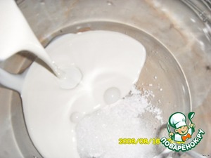 Крем. В чашку кладем сахарный песок, ванильный сахар, закрепитель для сливок, наливаем сливки, взбиваем.