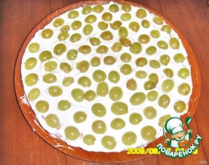 Обмазать корж кремом, сверху разложить на 2 части порезанный виноград,