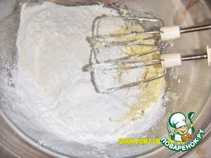 Масло взбить, добавить 100 г сахарного песка, растворить в нем сахар, добавить желтки, масса будет похожа на крем. Затем добавить муку и крахмал. Перемешать.