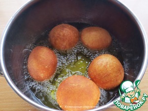 В глубокой сковороде накалить масло, ровно столько, чтобы пончики плавали, не касаясь дна. После чего обжарить пончики с двух сторон до румяного цвета и положить на салфетку, чтобы впиталось лишнее масло.