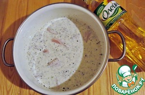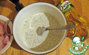Заливаем пряности кефиром. Солим и перчим по вкусу. Маринад готов.
