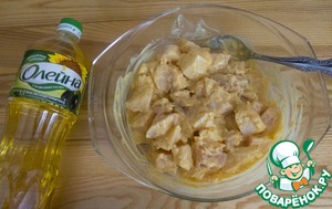 Рыбу кладем в йогуртовый маринад, аккуратно перемешиваем и убираем в сторону на полчаса.