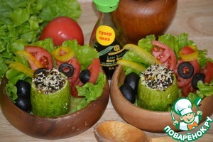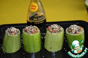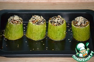 С подсоленных стаканчиков сливаем образовавшийся сок и начиняем их полученным фаршем, сверху присыпаем кунжутным семенем.