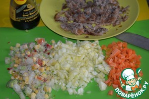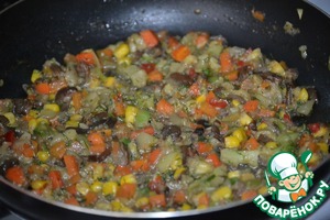Теперь займемся начинкой для цукини. Я нарезала кубиком морковь, измельчила вынутые серединики, добавила мороженую овощную смесь с кукурузой, луком и сладким перцем, поэтому в свежем виде это уже не добавляла. Грибы тоже были мороженые - опятки, можно любые, в том числе и свежие.