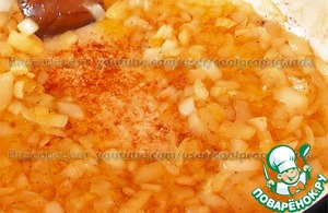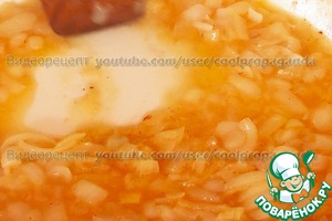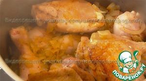 Курицу переложите в кастрюлю, а на той же сковородке с тем же маслом поджарьте нарубленный мелкими кубиками лук до золотистого цвета. На дне появится карамельный нагар (это карамелизуется сахар, который содержится в луковом соке) и результат реакции Майяра.