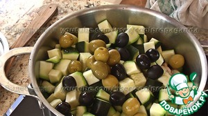 За 5-7 минут до готовности курице добавьте цукини и оливки в кастрюлю и выправьте блюдо на соль и перец.