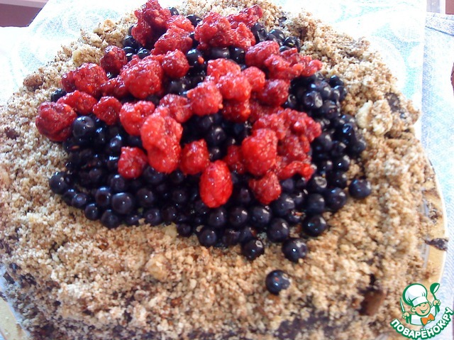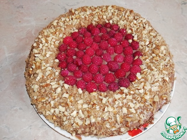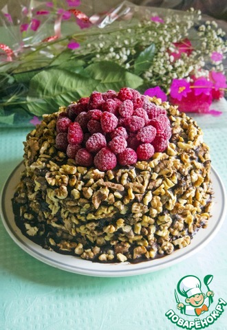 Бока торта обсыпать грецким орехом. Верх украсить замороженной малиной. Безусловно, торту необходимо постоять ночь в холоде, что бы он пропитался основательно и стал вкуснее. А утром, с огромным удовольствием попить чайку! Приятного!!