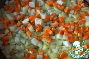 Морковь и лук очистить и нарезать не крупно. В сковороде разогреть масло и обжарить на сильном огне лук и морковь примерно пару минут.