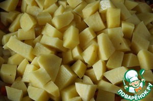 Добавляем очищенный и нарезанный средним кубиком картофель и продолжаем жарить на среднем огне минут 10, периодически перемешивая.