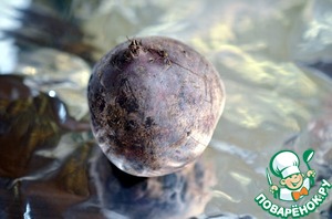Вымойте свеклу, заверните в фольгу и запекайте в разогретой до 180 С духовке 1 час 20 минут. Готовая свекла должна легко протыкаться шпажкой. Достаньте и остудите при комнатной температуре.
