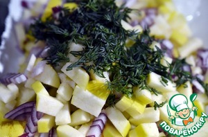 Листья укропа отделите от стеблей. Смешайте булгур с яблоком, луком и укропом.