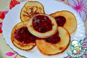 Подаем с медом, вареньем, сметаной. У меня были замороженные ягоды, протертые с сахаром.