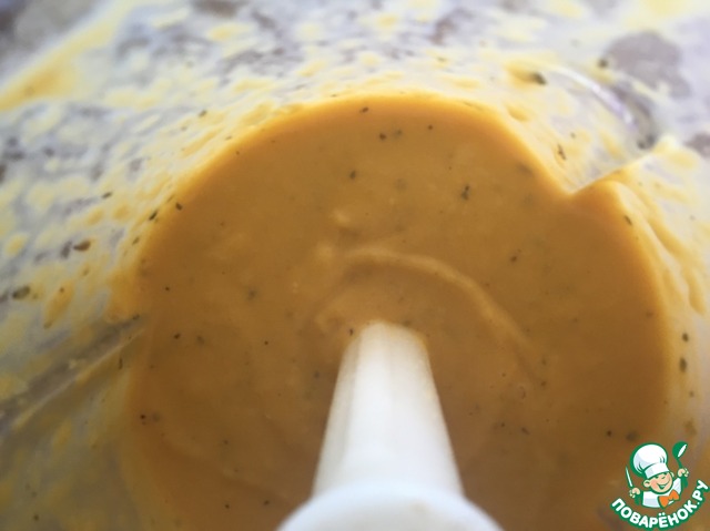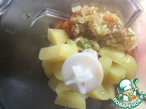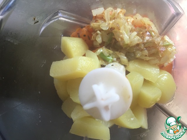 Я не сфотографировала, как я поджарила лук. Мелко нарезать и на оливковом масле поджарить с парой щепоток сахара, чтобы карамелизовался. Тыкву, картошку и лук пюрировать.