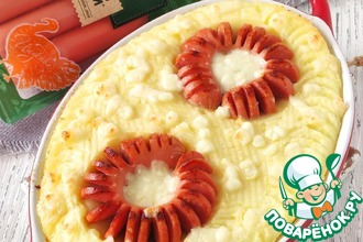 Уложить в форму слоями: пюре + курица + лук + грибы + курица + кукуруза + сыр. Запекать в духовке 20 -30 минут.