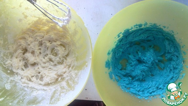 Можно добавлять в крем красители (ну это конечно по желанию каждого ). Например я разделила крем на 2 части, и в 1 часть добавила синий краситель.:)