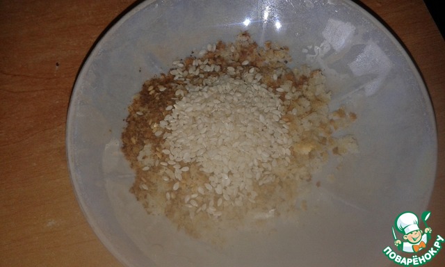 В это время в равных пропорциях смешать кунжут и сухари. Разогреть масло