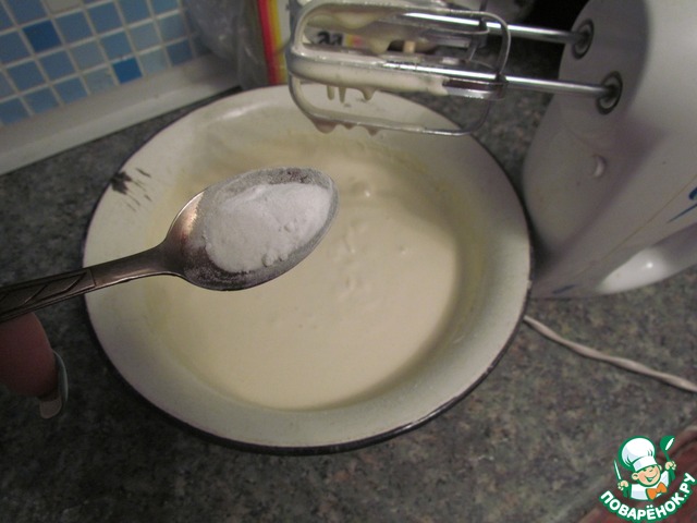 Т. к. у меня не было лимона, я развела лимонную кислоту и ею загасила соду. взбиваем.