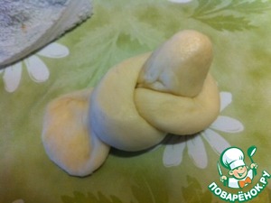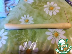 Теперь из подошедших "яичек" катаем жгутики. Причем катаем только середину, края не трогаем - это будут головка жаворонка и хвостик. Раскатываем где-то на две ладони. Должна получиться вот такая "косточка".