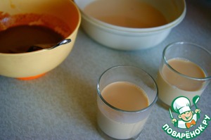 Пока масса остывает, займемся желатином. Заранее разбухший желатин растапливаем на водяной бане и добавляем в таких же пропорциях в чашки с массой. (т. е. в кофейную больше половины, в какао остальное). Тщательно перемешиваем.
