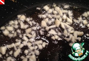 На эту же сковороду вливаем оставшееся масло, кладем мелконарубленный чеснок и помешивая, дожидаемся появления аромата.