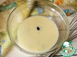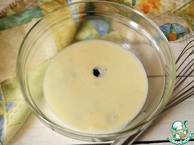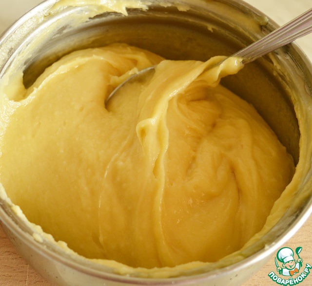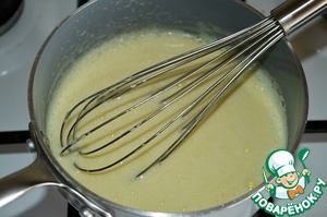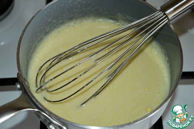 Вливаем большую часть в наши желтки, хорошо перемешиваем венчиком и возвращаем в сотейник к оставшейся молочной массе. Продолжаем активно мешать и прогревать смесь до 84 градусов и легкого загустения! Ни в коем случае не доводим до кипения, иначе желтки свернутся! Если сомневаетесь и боитесь перегреть, то эту процедуру проводите на паровой бане! -
