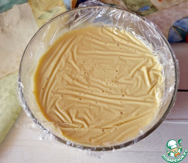 Накрываем пищевой пленкой так как показано на фото и полностью охлаждаем. Убираем в холодильник на 12 часов! -