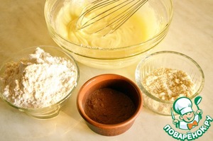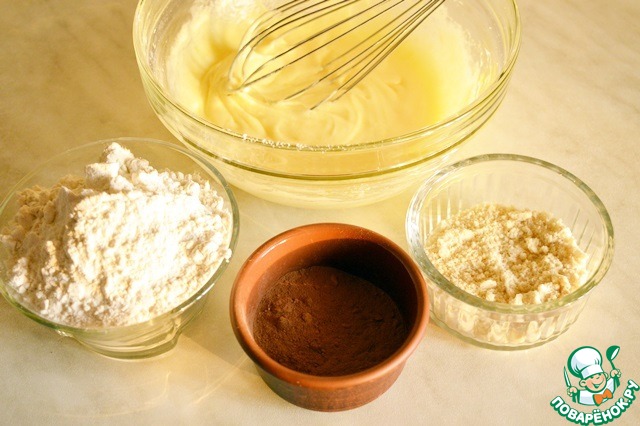 Подмешиваем миндальную муку, пшеничную муку и какао-порошок.