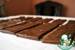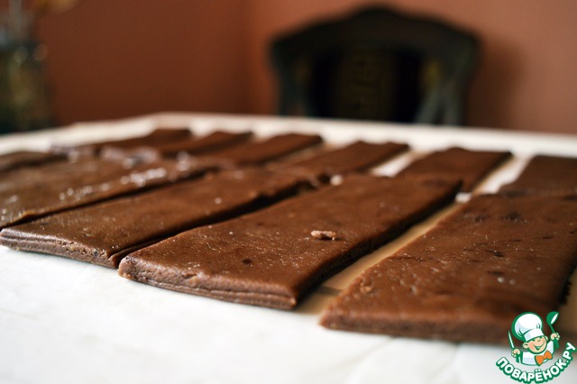 Через час раскатываем тесто в пласт толщиной 4 мм и вырезаем прямоугольники 4*12 см. Укладываем на пергамент и отправляем в разогретую до 170 градусов духовку. Выпекаем 15 минут.