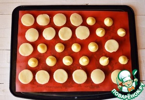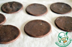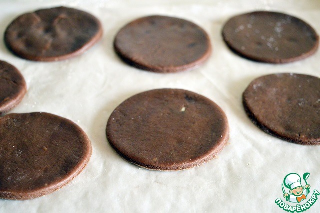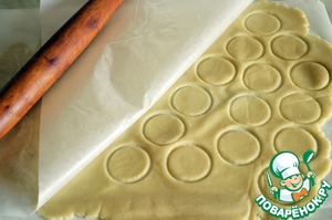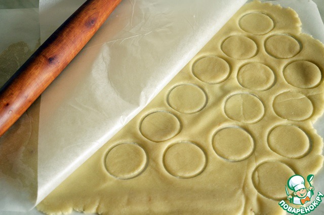 Смешиваем сахар со сливочным маслом и мукой. Замешиваем тесто. Тонко раскатываем его между двух листов пергамента. С помощью выемки или стакана вырезаем круги по 4 см в диаметре и отправляем их в холодильник.