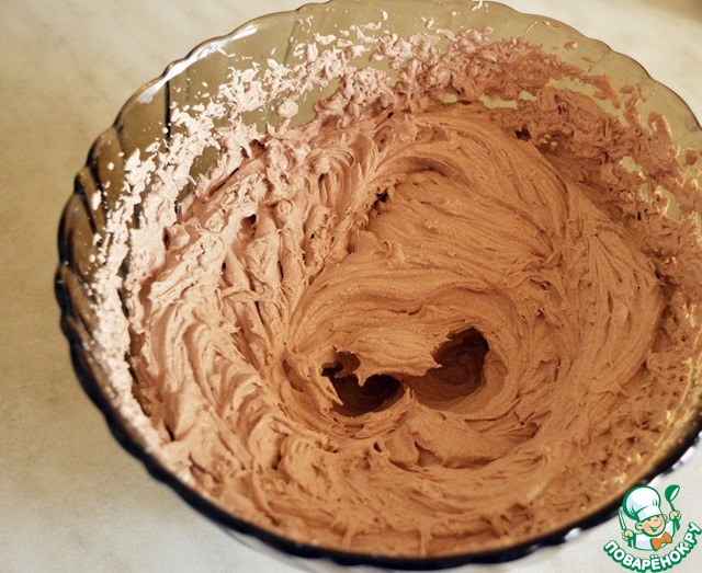 Достаем нашу заготовку для шоколадного мусса из холодильника и хорошо взбиваем миксером. Получаем очень воздушный крем! Выкладываем его в кондитерский мешок с фигурной насадкой. В зависимости от выбранного варианта подачи десерта используем насадку Сант Оноре (для волнистого варианта на прямоугольниках) или звездочку (для кругов).