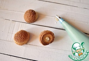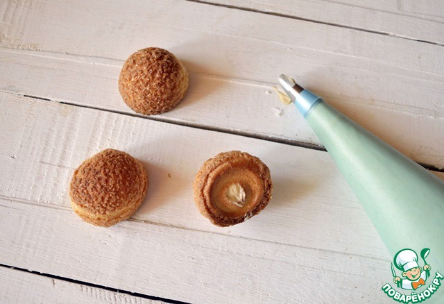 Получаем вот такие красивенькие эклерчики с карамельной шапочкой. Полностью их остужаем!