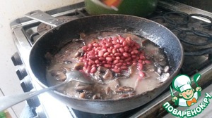 Легко поджаривать ДО ПОЧТИ полного испарения масла ( и воды ( если грибы замороженные)). Кладем к грибам фасоль. Мешаем.