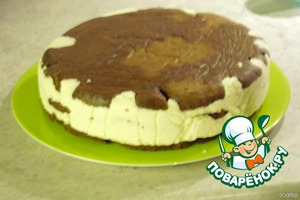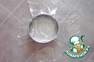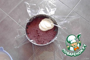 Собираем торт! В форму, в которой пекли, разложить крест-накрест плёнку (я не знаю как по-русски она называется).